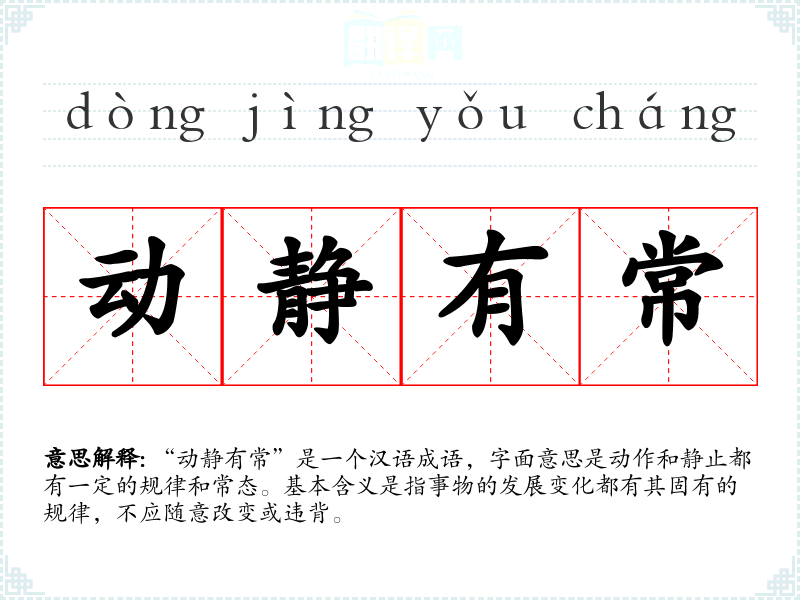 “动静有常”是一个汉语成语,字面意思是动作和静止都有一定的规律和常态。基本含义是指事物的发展变化都有其固有的规律,不应随意改变或违背。