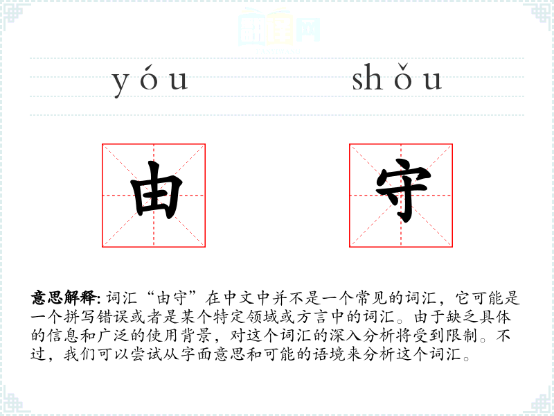 词汇“由守”在中文中并不是一个常见的词汇,它可能是一个拼写错误或者是某个特定领域或方言中的词汇。由于缺乏具体的信息和广泛的使用背景,对这个词汇的深入分析将受到限制。不过,我们可以尝试从字面意思和可能的语境来分析这个词汇。