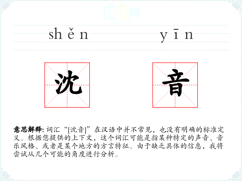 如果“沈音”是指某种声音或音乐风格,它可能指的是低沉、沉稳或者具有某种地方特色的声音。如果是指方言特征,那么它可能是指某个地区特有的发音方式或语调。