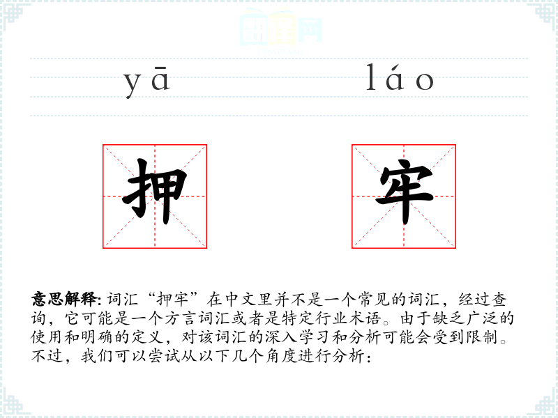 由于“押牢”不是一个标准汉语词汇,我们无法给出一个确切的基本定义。它可能是指“确保固定”或“牢牢抓住”的意思,但这仅仅是基于字面组合的猜测。