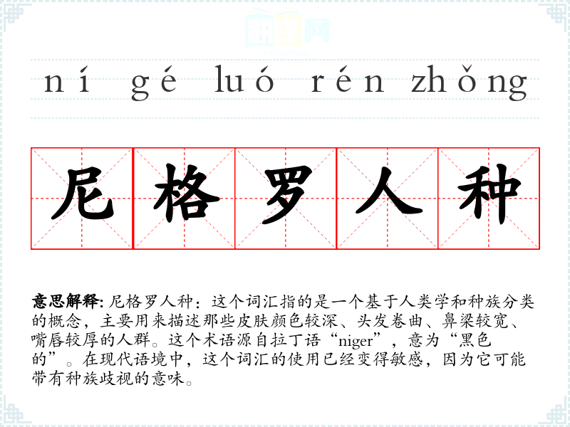 尼格罗人种:这个词汇指的是一个基于人类学和种族分类的概念,主要用来描述那些皮肤颜色较深、头发卷曲、鼻梁较宽、嘴唇较厚的人群。这个术语源自拉丁语“niger”,意为“黑色的”。在现代语境中,这个词汇的使用已经变得敏感,因为它可能带有种族歧视的意味。