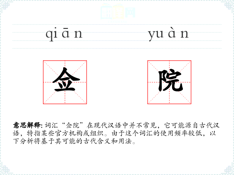 “佥院”字面意思是由“佥”和“院”两个字组成。在古代汉语中,“佥”有共同、一起的意思,而“院”通常指官方机构或学校。因此,“佥院”可能指的是一个由多人共同管理的官方机构或学校。