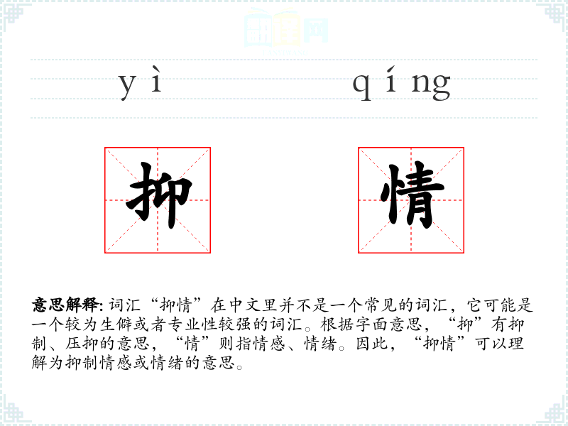 词汇“抑情”在中文里并不是一个常见的词汇,它可能是一个较为生僻或者专业性较强的词汇。根据字面意思,“抑”有抑制、压抑的意思,“情”则指情感、情绪。因此,“抑情”可以理解为抑制情感或情绪的意思。