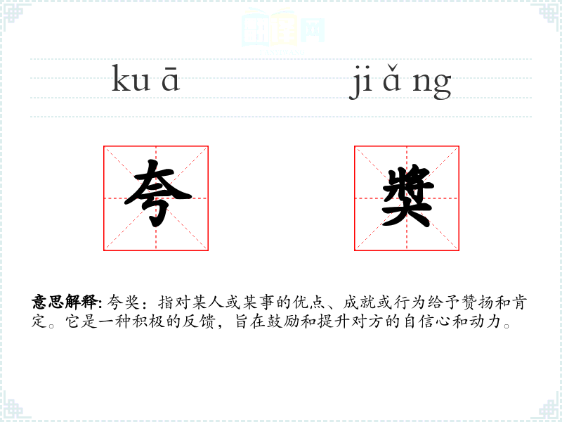 - 词源:“夸奖”一词由“夸”和“奖”两个字组成。“夸”字古汉语中意为夸大、夸耀,而“奖”字意为奖励、鼓励。两者结合,形成了现代汉语中的“夸奖”,意为通过夸赞来给予奖励。