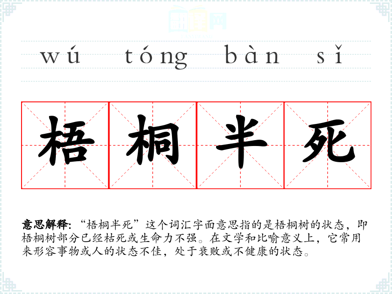 “梧桐半死”这个词汇字面意思指的是梧桐树的状态,即梧桐树部分已经枯死或生命力不强。在文学和比喻意义上,它常用来形容事物或人的状态不佳,处于衰败或不健康的状态。