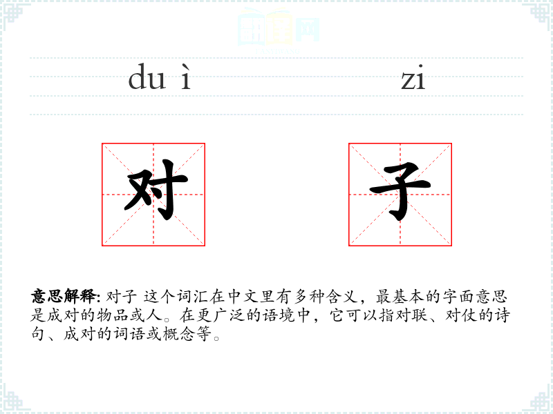 "对子"的意思解释、对子是什么意思由翻译网汉语词典查词提供。