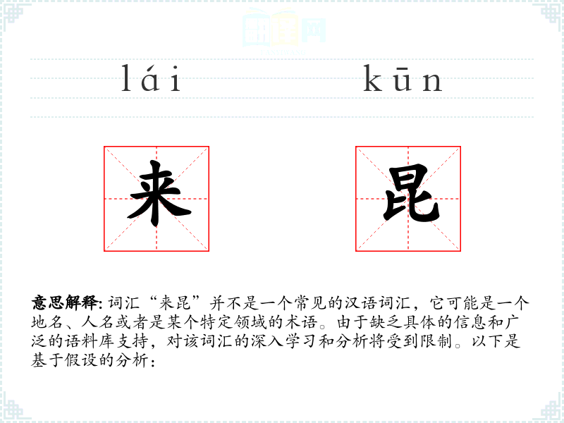由于“来昆”不是一个标准词汇,对其的理解和应用将非常有限。在语言学*和表达中,了解词汇的背景和语境是非常重要的。如果“来昆”是一个特定领域的术语或者个人创造的词汇,那么它的意义和使用将更加局限。
