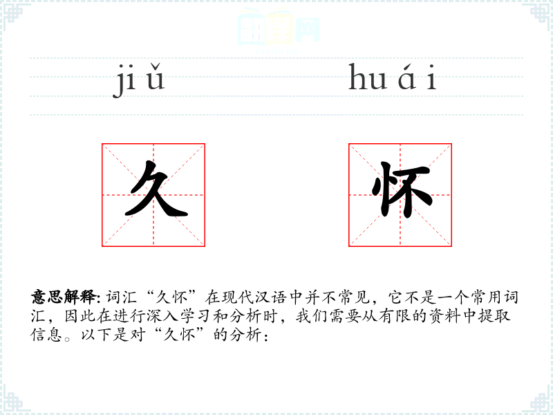 词汇“久怀”在现代汉语中并不常见,它不是一个常用词汇,因此在进行深入学习和分析时,我们需要从有限的资料中提取信息。以下是对“久怀”的分析:
