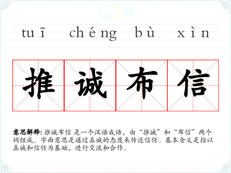 推诚布信 是一个汉语成语,由“推诚”和“布信”两个词组成。字面意思是通过真诚的态度来传达信任。基本含义是指以真诚和信任为基础,进行交流和合作。