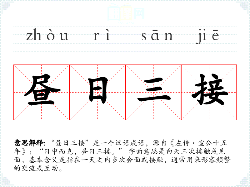 “昼日三接”是一个汉语成语,源自《左传·宣公十五年》:“日中而克,昼日三接。” 字面意思是白天三次接触或见面。基本含义是指在一天之内多次会面或接触,通常用来形容频繁的交流或互动。