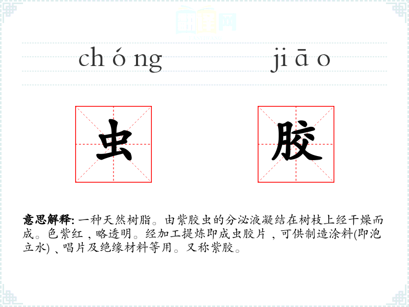 一种天然树脂。由紫胶虫的分泌液凝结在树枝上经干燥而成。色紫红﹐略透明。经加工提炼即成虫胶片﹐可供制造涂料(即泡立水)﹑唱片及绝缘材料等用。又称紫胶。
