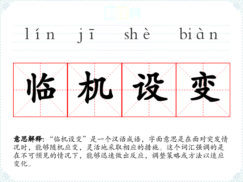 “临机设变”是一个汉语成语,字面意思是在面对突发情况时,能够随机应变,灵活地采取相应的措施。这个词汇强调的是在不可预见的情况下,能够迅速做出反应,调整策略或方法以适应变化。
