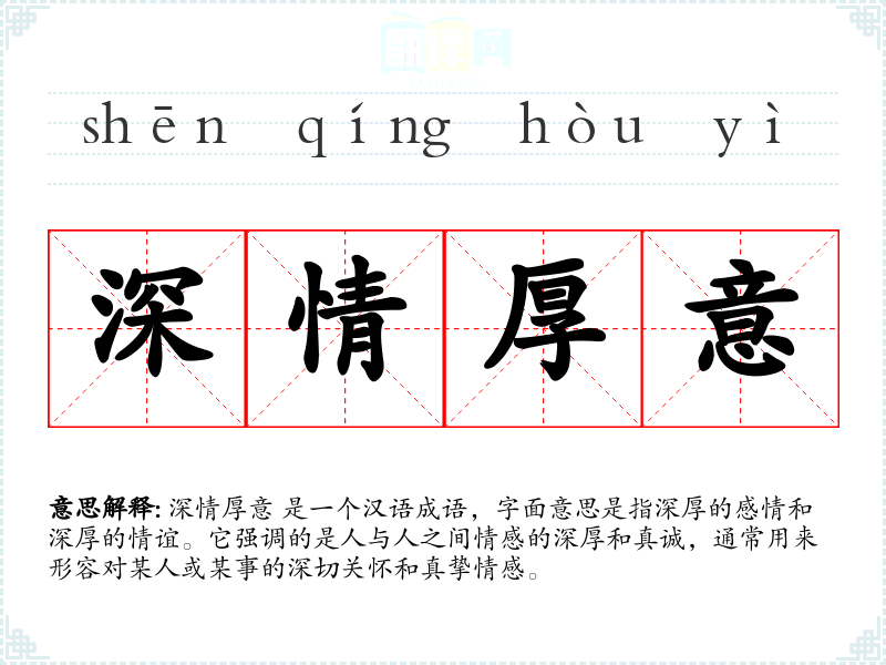 深情厚意 是一个汉语成语,字面意思是指深厚的感情和深厚的情谊。它强调的是人与人之间情感的深厚和真诚,通常用来形容对某人或某事的深切关怀和真挚情感。
