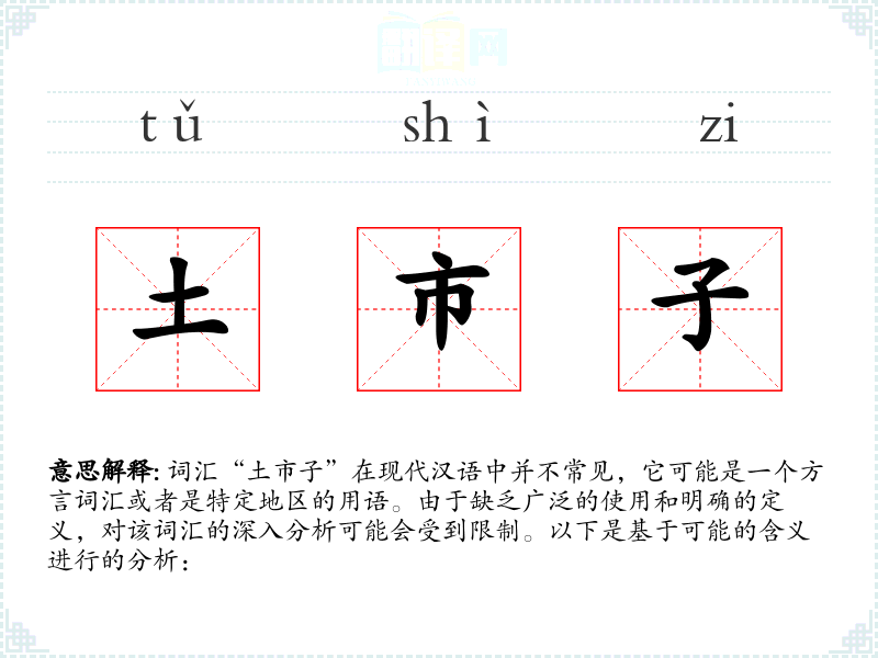 词汇“土市子”在现代汉语中并不常见,它可能是一个方言词汇或者是特定地区的用语。由于缺乏广泛的使用和明确的定义,对该词汇的深入分析可能会受到限制。以下是基于可能的含义进行的分析: