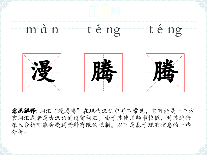 词汇“漫腾腾”在现代汉语中并不常见,它可能是一个方言词汇或者是古汉语的遗留词汇。由于其使用频率较低,对其进行深入分析可能会受到资料有限的限制。以下是基于现有信息的一些分析: