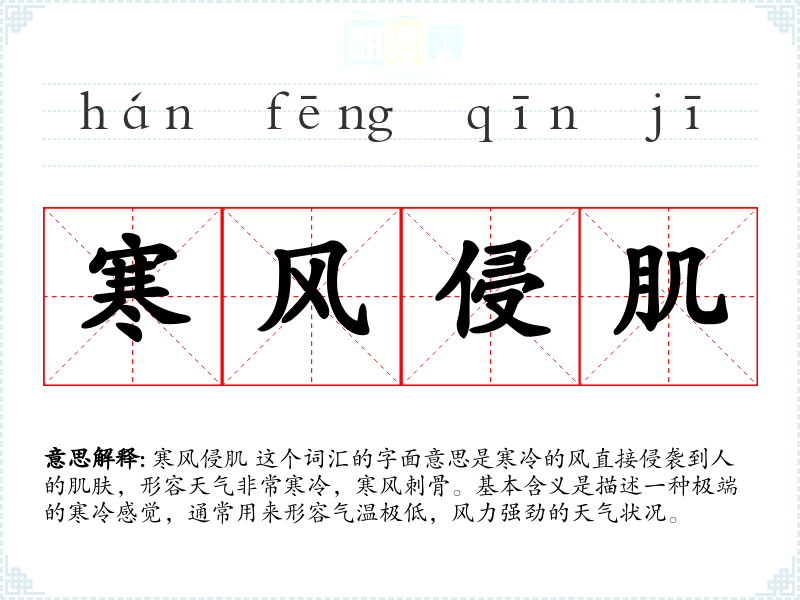 寒风侵肌 这个词汇的字面意思是寒冷的风直接侵袭到人的肌肤,形容天气非常寒冷,寒风刺骨。基本含义是描述一种极端的寒冷感觉,通常用来形容气温极低,风力强劲的天气状况。