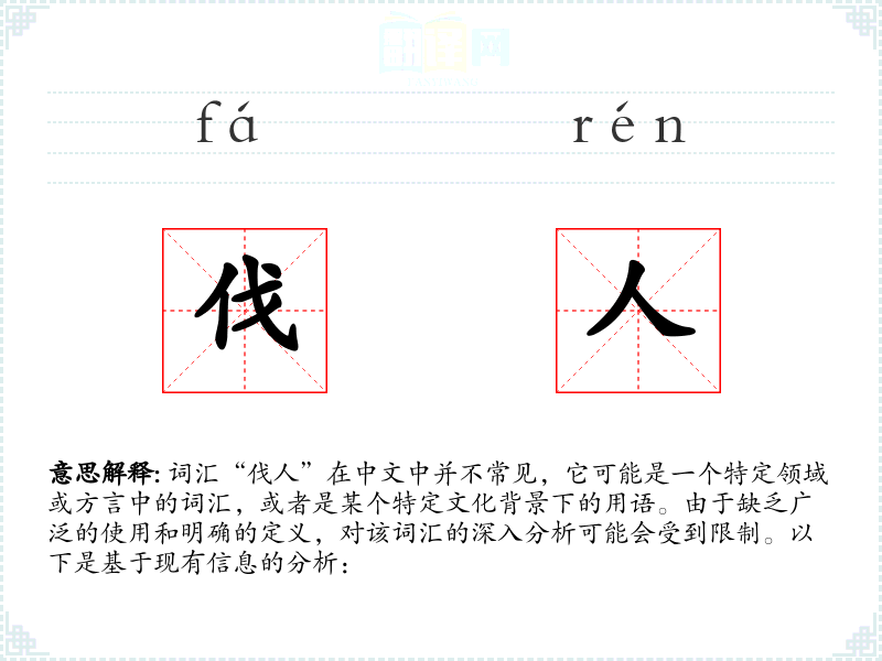 “伐人”这个词汇的含义和使用非常有限,需要结合具体语境来理解。在语言学习和表达中,它可能不是一个重要的词汇,但对于特定文化或方言的研究可能具有一定的价值。