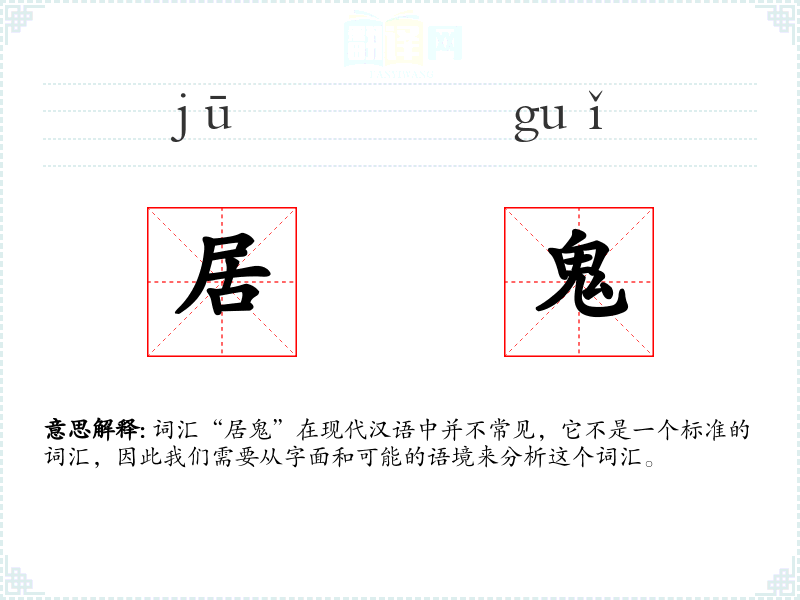 词汇“居鬼”在现代汉语中并不常见,它不是一个标准的词汇,因此我们需要从字面和可能的语境来分析这个词汇。