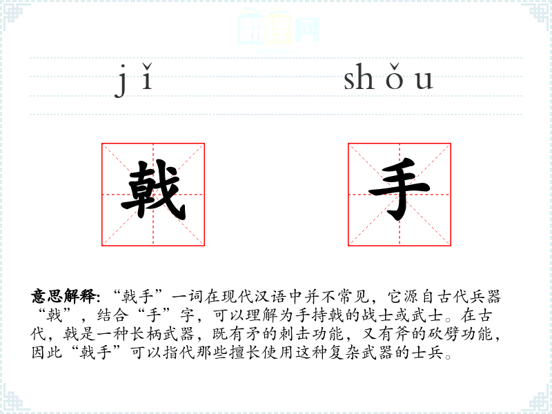“戟手”一词在现代汉语中并不常见,它源自古代兵器“戟”,结合“手”字,可以理解为手持戟的战士或武士。在古代,戟是一种长柄武器,既有矛的刺击功能,又有斧的砍劈功能,因此“戟手”可以指代那些擅长使用这种复杂武器的士兵。