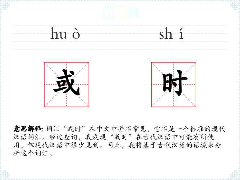 词汇“或时”在中文中并不常见,它不是一个标准的现代汉语词汇。经过查询,我发现“或时”在古代汉语中可能有所使用,但现代汉语中很少见到。因此,我将基于古代汉语的语境来分析这个词汇。