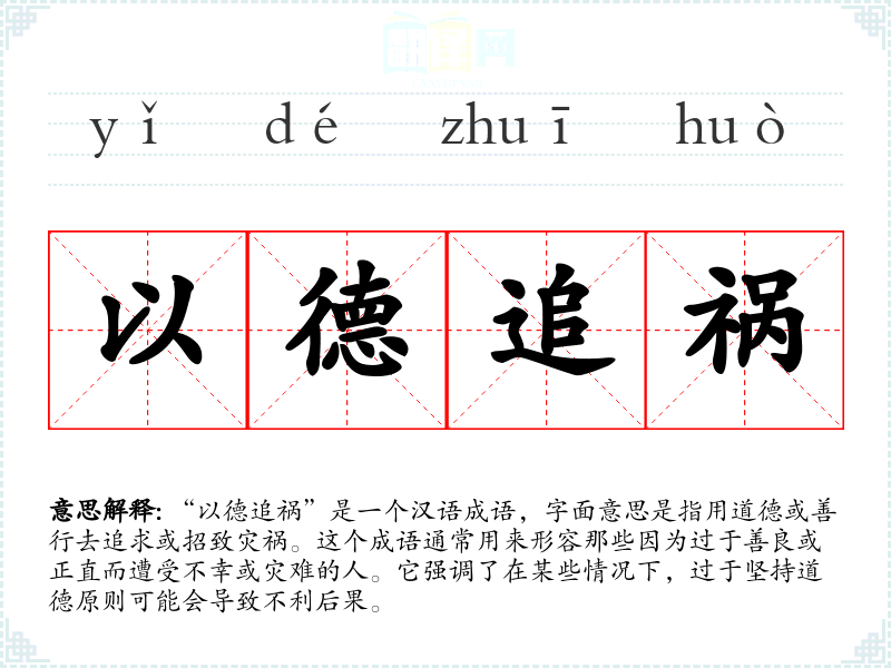 在文学作品中,“以德追祸”常被用来描绘那些因为坚守原则而遭遇不幸的角色,以此来探讨道德与命运的关系。在口语中,这个成语可能被用来告诫他人不要过于理想化或不切实际地坚持道德标准。在专业领域,如哲学或伦理学中,这个成语可以用来讨论道德行为的潜在风险和后果。