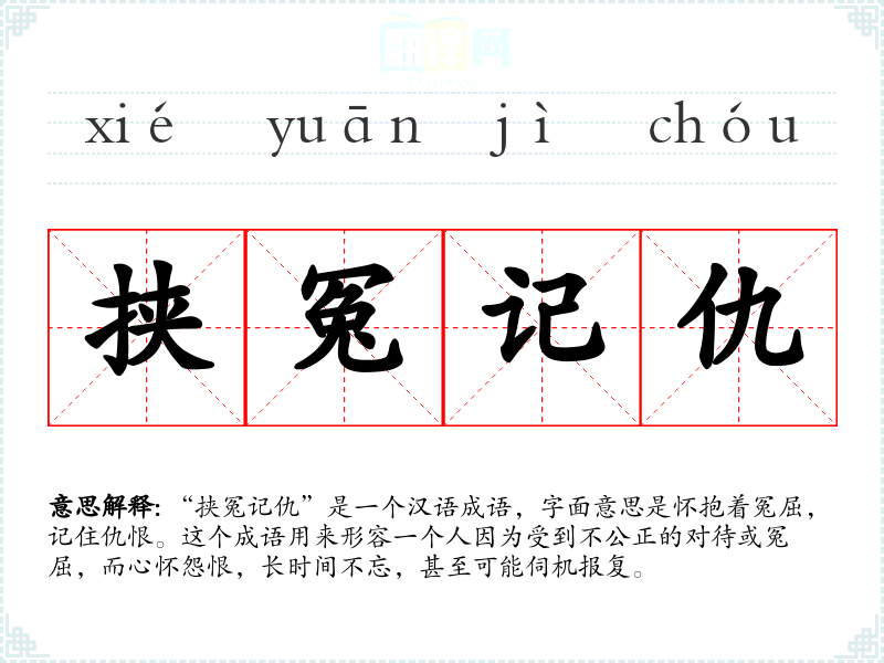“挟冤记仇”是一个汉语成语,字面意思是怀抱着冤屈,记住仇恨。这个成语用来形容一个人因为受到不公正的对待或冤屈,而心怀怨恨,长时间不忘,甚至可能伺机报复。