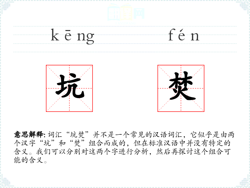 词汇“坑焚”并不是一个常见的汉语词汇,它似乎是由两个汉字“坑”和“焚”组合而成的,但在标准汉语中并没有特定的含义。我们可以分别对这两个字进行分析,然后再探讨这个组合可能的含义。
