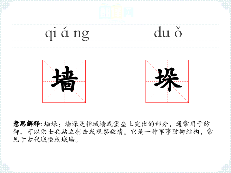- 文学:在文学作品中,墙垛常被用来描绘战争场景或历史背景,如“士兵们在墙垛上严阵以待,准备迎接敌人的进攻。”