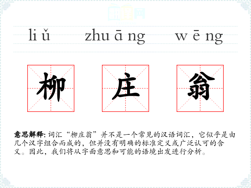 词汇“柳庄翁”并不是一个常见的汉语词汇,它似乎是由几个汉字组合而成的,但并没有明确的标准定义或广泛认可的含义。因此,我们将从字面意思和可能的语境出发进行分析。