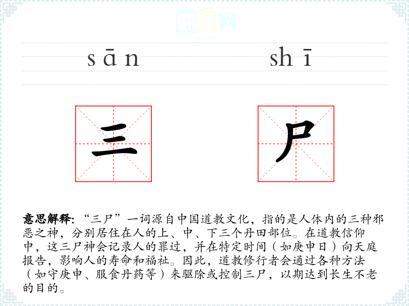 “三尸”一词源自**道教文化,指的是人体内的三种邪恶之神,分别居住在人的上、中、下三个丹田部位。在道教信仰中,这三尸神会记录人的罪过,并在特定时间(如庚申日)向天庭报告,影响人的寿命和福祉。因此,道教修行者会通过各种方法(如守庚申、服食丹药等)来驱除或控制三尸,以期达到长生不老的目的。