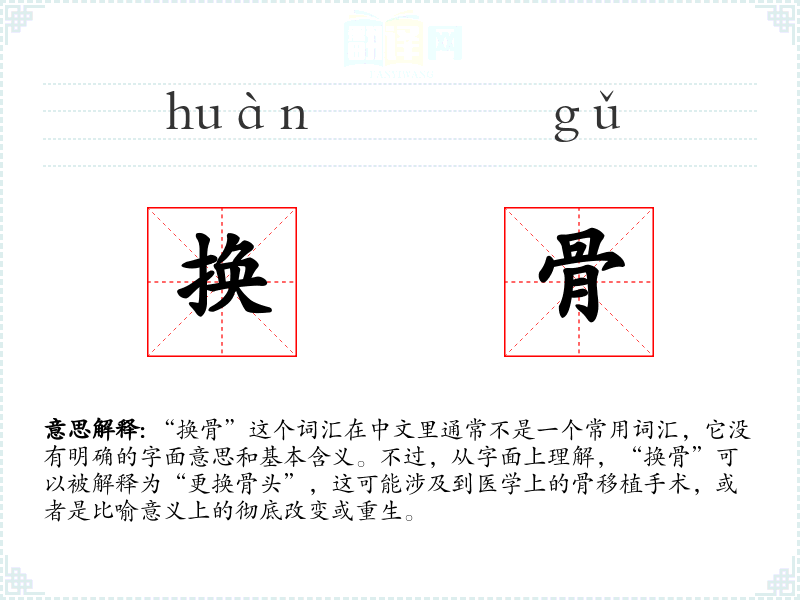 “换骨”这个词汇在中文里通常不是一个常用词汇,它没有明确的字面意思和基本含义。不过,从字面上理解,“换骨”可以被解释为“更换骨头”,这可能涉及到医学上的骨移植手术,或者是比喻意义上的彻底改变或重生。