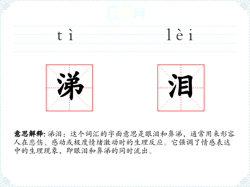 - 反义词:无(因为“涕泪”描述的是一种情感的生理反应,通常没有直接的反义词)