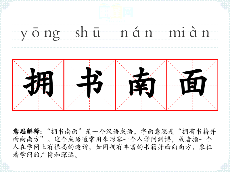 “拥书南面”是一个汉语成语,字面意思是“拥有书籍并面向南方”。这个成语通常用来形容一个人学问渊博,或者指一个人在学问上有很高的造诣,如同拥有丰富的书籍并面向南方,象征着学问的广博和深远。