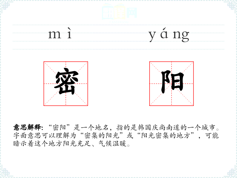 “密阳”是一个地名,指的是韩国庆尚南道的一个城市。字面意思可以理解为“密集的阳光”或“阳光密集的地方”,可能暗示着这个地方阳光充足、气候温暖。