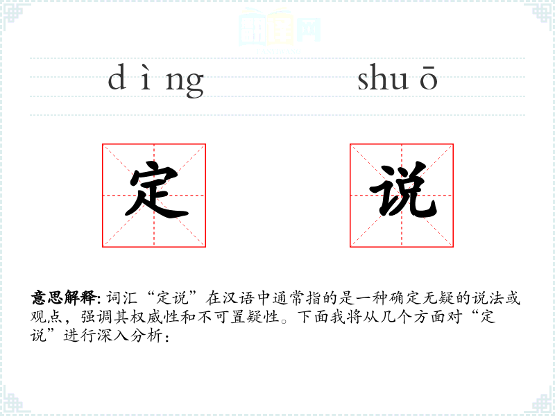 词汇“定说”在汉语中通常指的是一种确定无疑的说法或观点,强调其权威性和不可置疑性。下面我将从几个方面对“定说”进行深入分析: