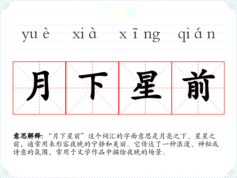 “月下星前”这个词汇的字面意思是月亮之下、星星之前,通常用来形容夜晚的宁静和美丽。它传达了一种浪漫、神秘或诗意的氛围,常用于文学作品中描绘夜晚的场景。