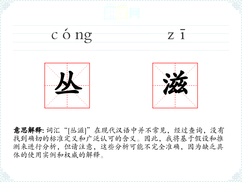 词汇“[丛滋]”在现代汉语中并不常见,经过查询,没有找到确切的标准定义和广泛认可的含义。因此,我将基于假设和推测来进行分析,但请注意,这些分析可能不完全准确,因为缺乏具体的使用实例和权威的解释。