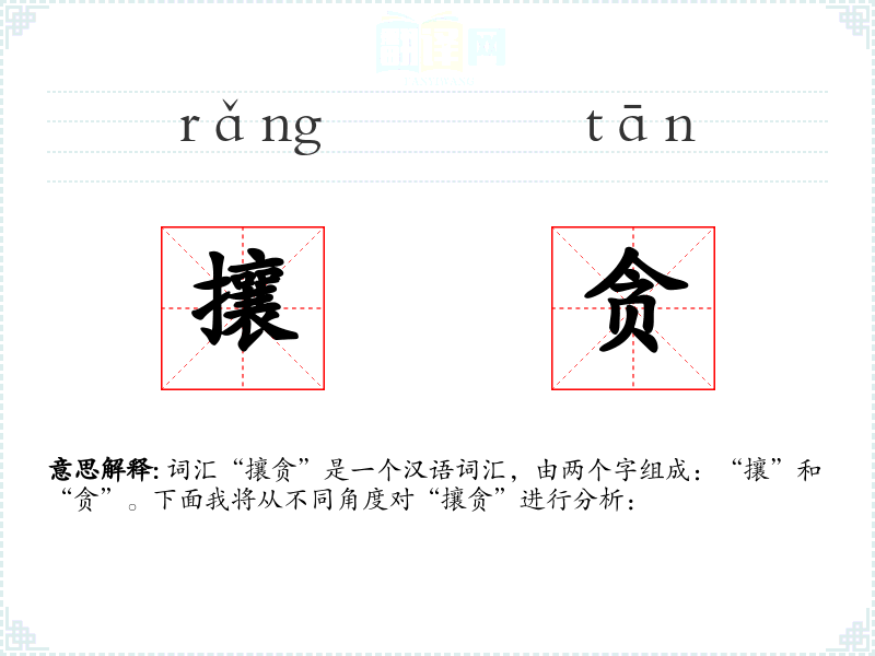“攘贪”字面意思是指抵制或消除贪婪的行为。其中,“攘”有排斥、抵御的意思,“贪”则指贪婪、贪心。结合起来,“攘贪”可以理解为通过某种手段或行为来抑制或消除贪婪。