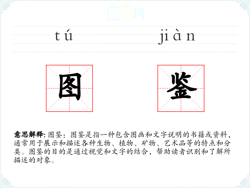 图鉴:图鉴是指一种包含图画和文字说明的书籍或资料,通常用于展示和描述各种生物、植物、矿物、艺术品等的特点和分类。图鉴的目的是通过视觉和文字的结合,帮助读者识别和了解所描述的对象。