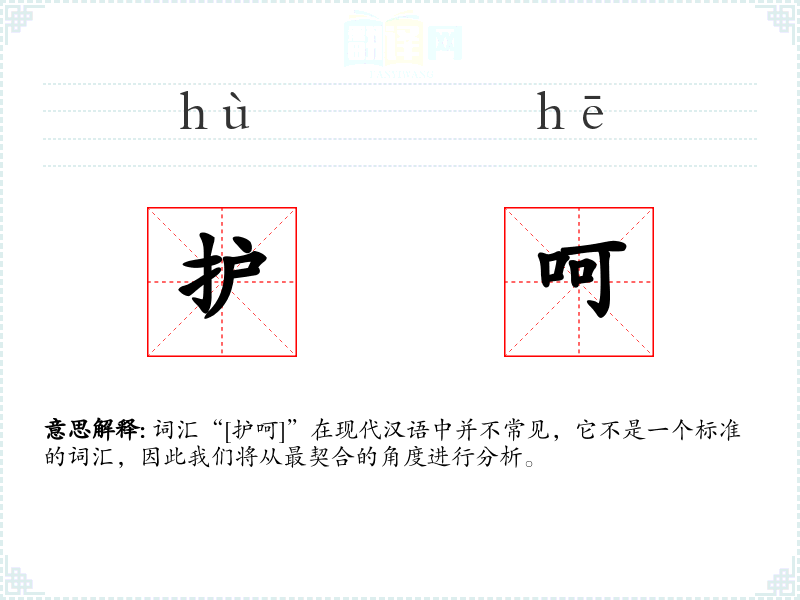 由于“[护呵]”不是一个标准的词汇,我们无法给出确切的基本定义。它可能是由两个字“护”和“呵”组合而成的,但这种组合在现代汉语中没有明确的意义。