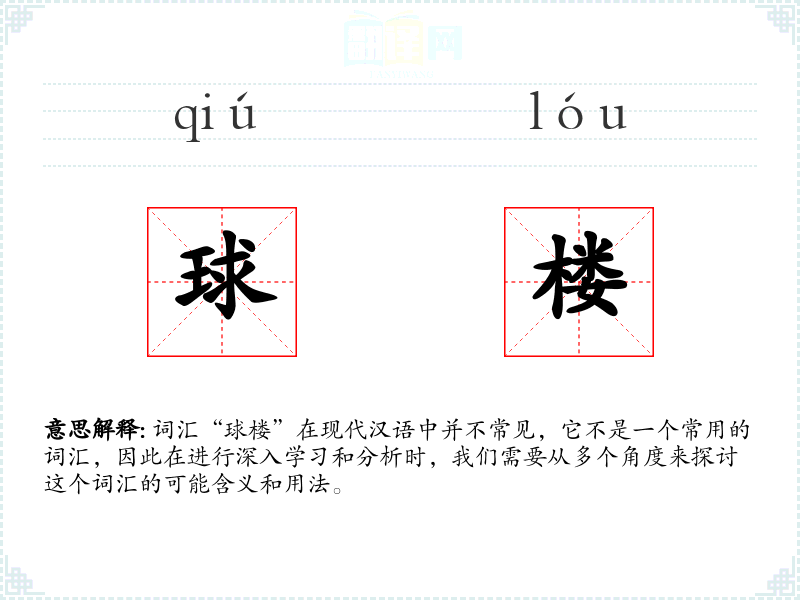 词汇“球楼”在现代汉语中并不常见,它不是一个常用的词汇,因此在进行深入学*和分析时,我们需要从多个角度来探讨这个词汇的可能含义和用法。