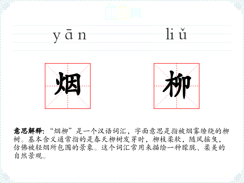 同义词:柔柳、柳烟、柳絮 反义词:硬木、松柏(这些词与“烟柳”在质感、形态上形成对比)
