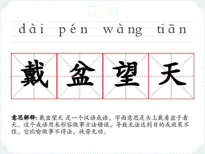 戴盆望天 是一个汉语成语,字面意思是头上戴着盆子看天。这个成语用来形容做事方法错误,导致无法达到目的或效果不佳。它比喻做事不得法,徒劳无功。