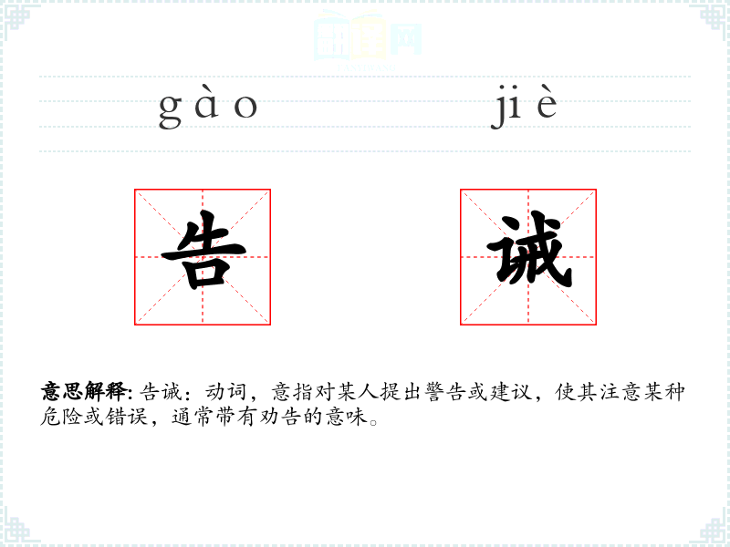 告诫:动词,意指对某人提出警告或建议,使其注意某种危险或错误,通常带有劝告的意味。
