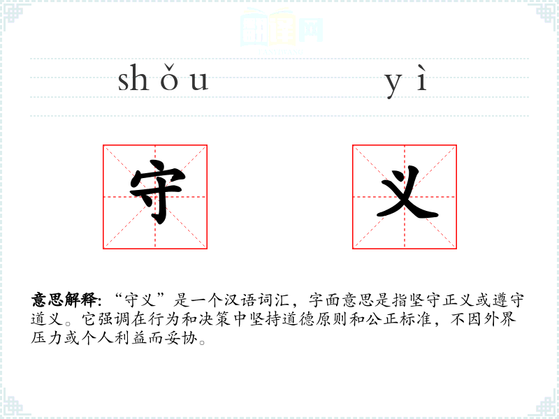 “守义”是一个汉语词汇,字面意思是指坚守正义或遵守道义。它强调在行为和决策中坚持道德原则和公正标准,不因外界压力或个人利益而妥协。