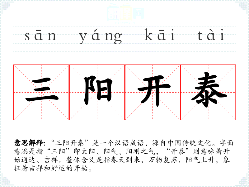 “三阳开泰”不仅是一个成语,更是一种文化符号,它承载了*人对美好生活的向往和对自然规律的尊重。在学汉语和了解**文化的过程中,理解和运用这一成语是非常重要的。