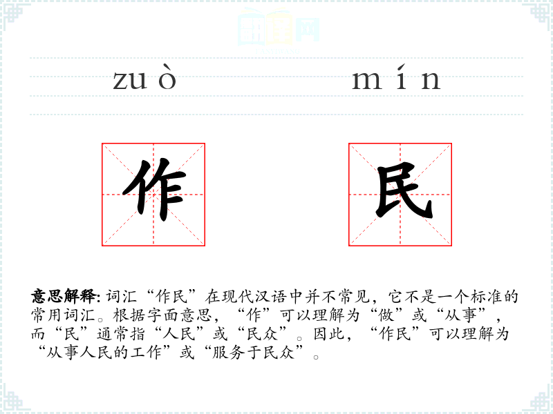 由于“作民”不是一个常用词汇,其词源和历史演变不详。它可能是由“作”和“民”两个字组合而成,表达一种为民众服务的概念。