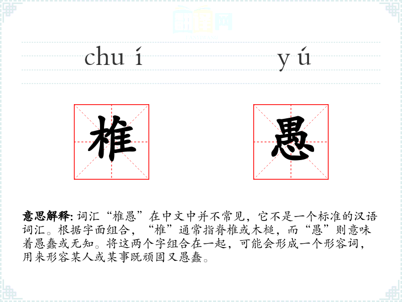 尽管“椎愚”不是一个常用词汇,但它展示了汉语中可以通过组合不同字来创造新词的能力。在语言学习和表达中,了解这种词汇的创造方式可以帮助我们更好地理解语言的灵活性和丰富性。