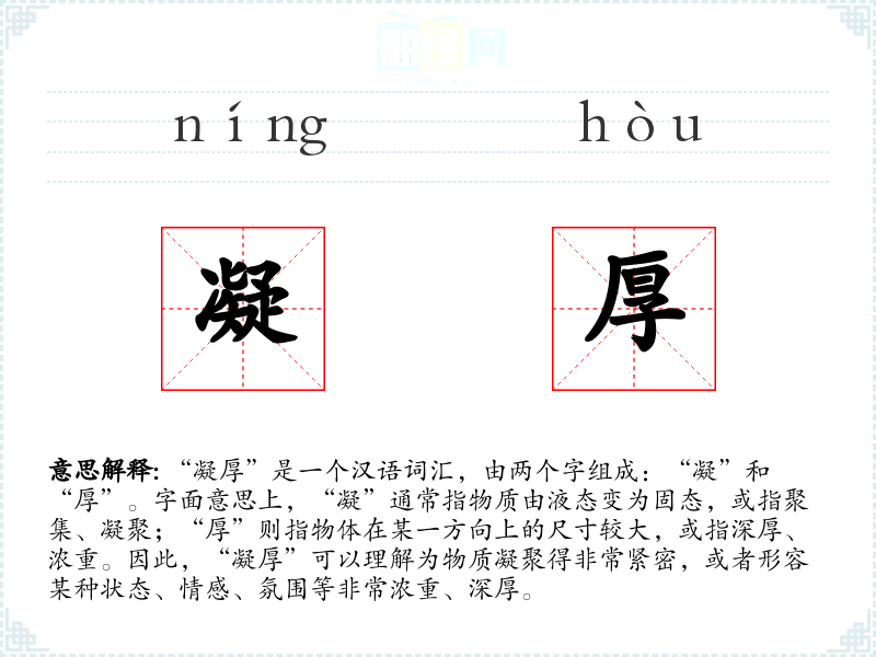 “凝”字最早见于《说文解字》,原意为水冻结;“厚”字则更早,见于甲骨文,原意为物体在某一方向上的尺寸大。两个字组合成“凝厚”,可能在古代文献中较少见,更多是在现代汉语中被使用和理解。