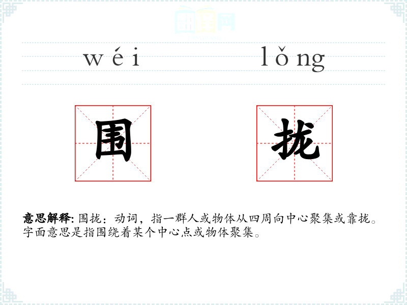 围拢:动词,指一群人或物体从四周向中心聚集或靠拢。字面意思是指围绕着某个中心点或物体聚集。